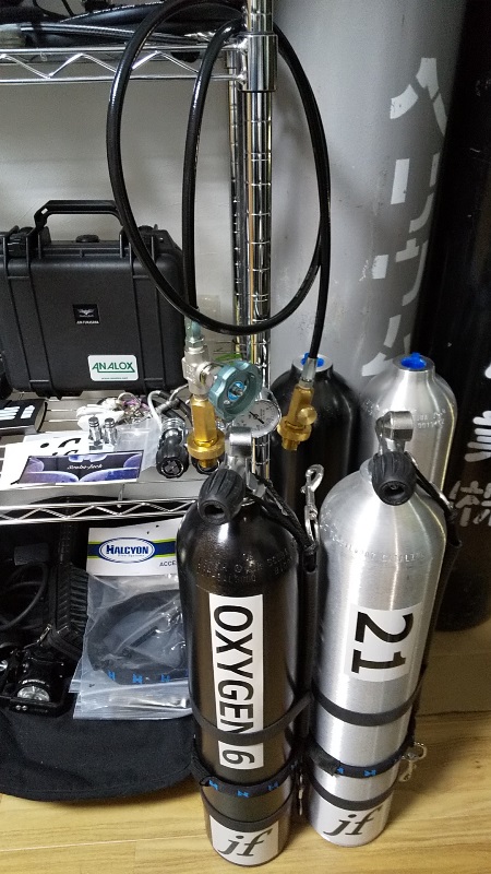 やっとデコタンクを4本手に入れました。 シリンダーと言うべきですが、タンクと言わせて下さい。 アルミの40キュービックです。 日本でアルミって手に入れるのは難しいんです。 そのうち2本を組み立てました。O2と50%ナイトロックス用です。